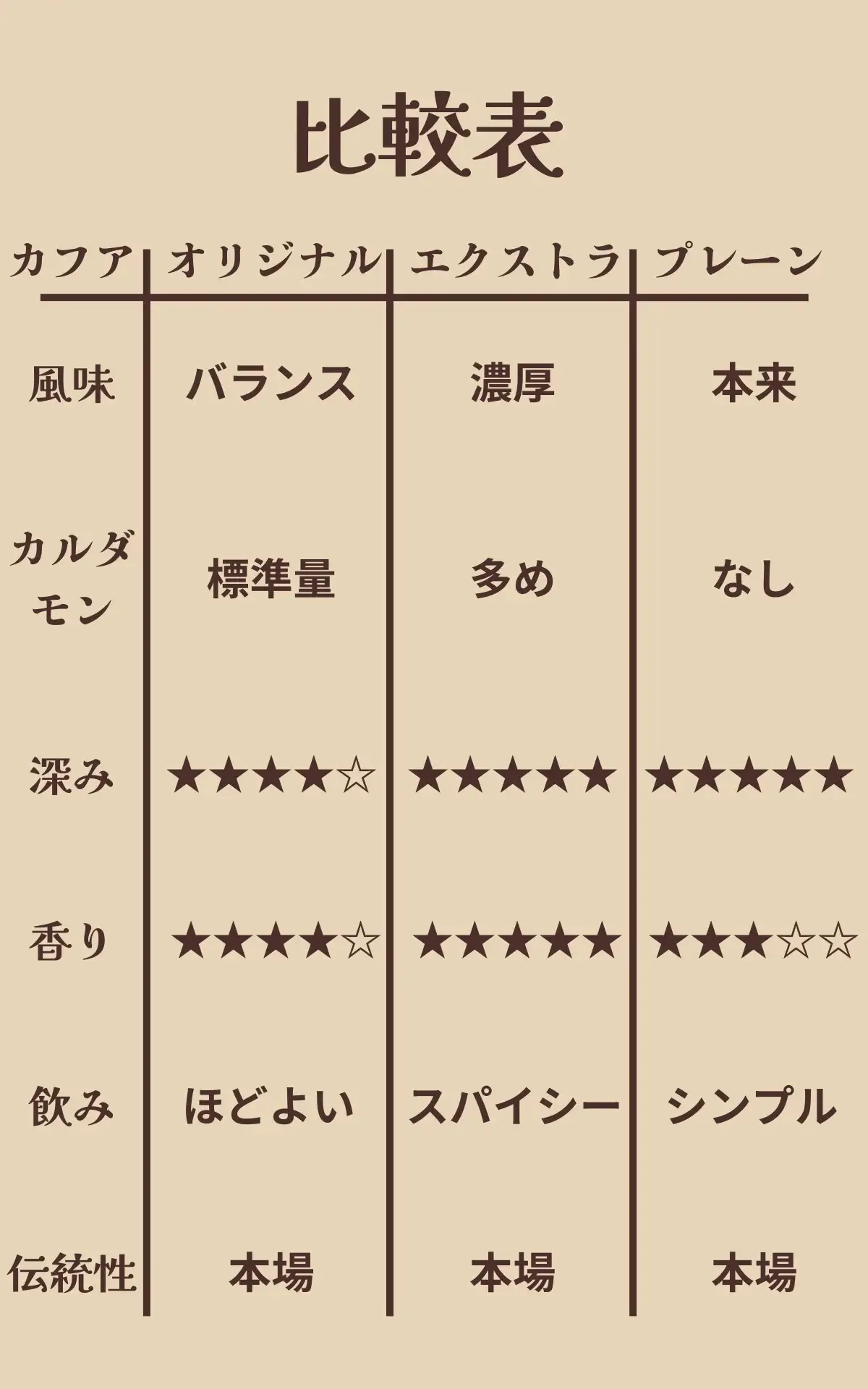 一般的な日本のコーヒーと比べ、カルダモンカフアは細挽きのコーヒー粉をお湯でじっくり煮出して作ります。フィルターは使わず、コーヒーの豊かな成分やスパイスの香りをそのまま楽しめるのが特徴です。